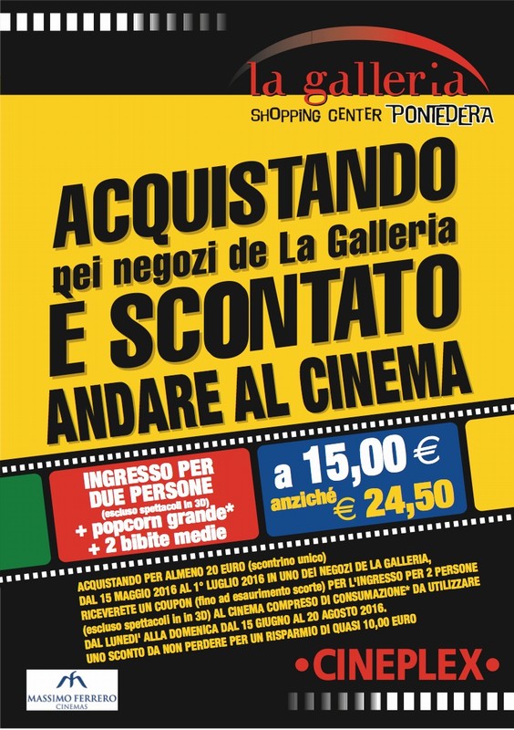 Acquistando per almeno 20 euro (scontrino unico) dal 15 maggio al 1° luglio 2016 in uno dei negozi de La Galleria riceverete un coupon (fino ad esaurimento scorte) per l'ingresso per 2 persone (escluso spettacoli in 3d) al cinema compreso di consumazione da utilizzare dal lunedi alla domenica dal 15 giugno al 20 agosto 2016 al prezzo di €.15,00 anziche' €.24,50